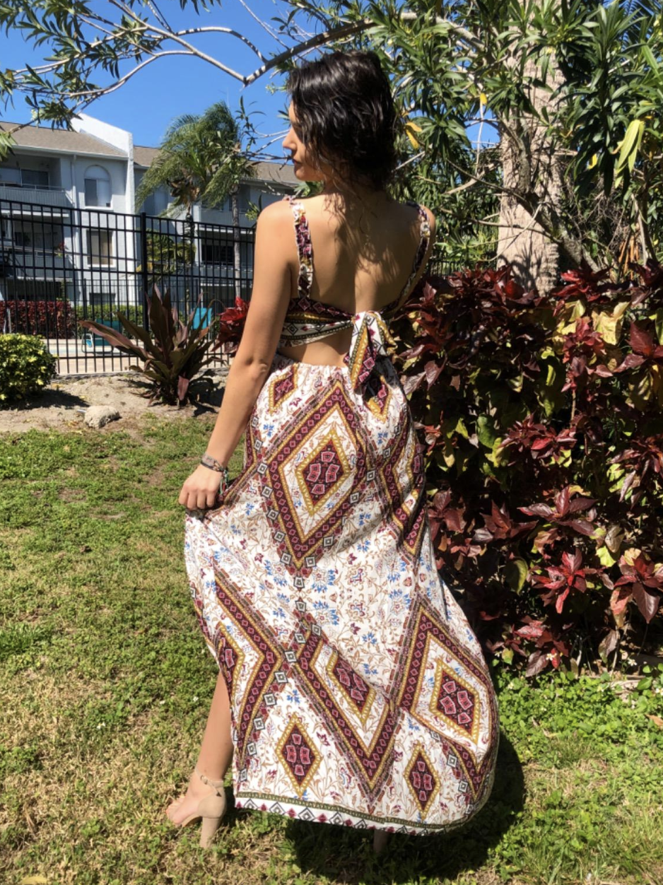 It has a soft V neck at center front and spaghetti straps over each shoulder. It has a soft V neck at both center front and center back necklines and delicate spaghetti straps. It has a soft V neck at both center front and center back necklines and delicate spaghetti straps.